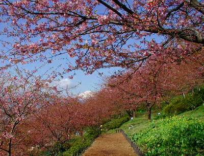 先ずは河津桜のある山の景色で、遠くに富士山が見える。