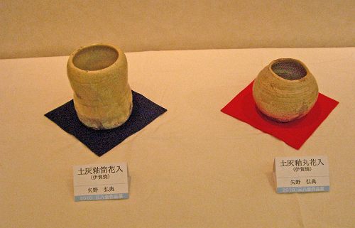 窓辺の花 広瀬和宏 土灰釉筒花入、土灰釉丸花入 矢野弘典