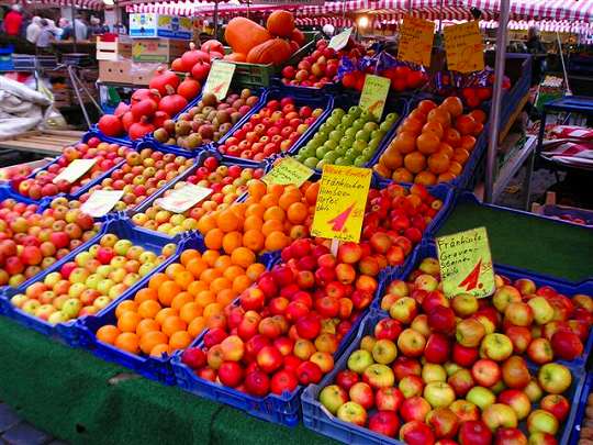ヨーロッパ何処に行っても旧市庁舎、教会等の前庭には市が立つ。パン屋さん、花屋さん、果物屋さん、魚屋さん、肉屋さん、雑貨屋さんなどなど。皆、布袋を持って買出しに来る。