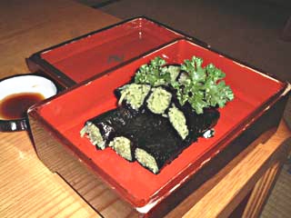 さて、「蕎麦寿司」だが、ゆでた蕎麦をすし酢で処理し、ほんのりとわさびをからめたものを海苔で巻いたものだ。