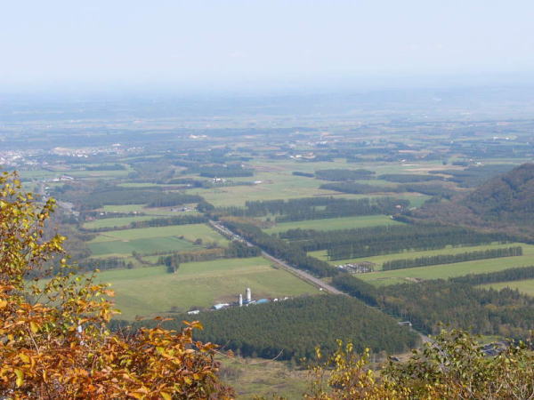 樹海ロードを登り切って、トンネルを抜けると日勝峠、眼下には色彩の乱舞から一転、緑の牧草地が連なる十勝平野が広がる。
