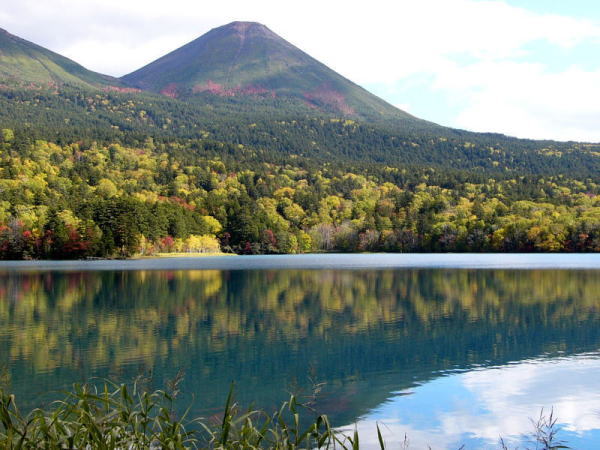 雌阿寒岳、雄阿寒岳と山麓の紅葉を映すオンネトー