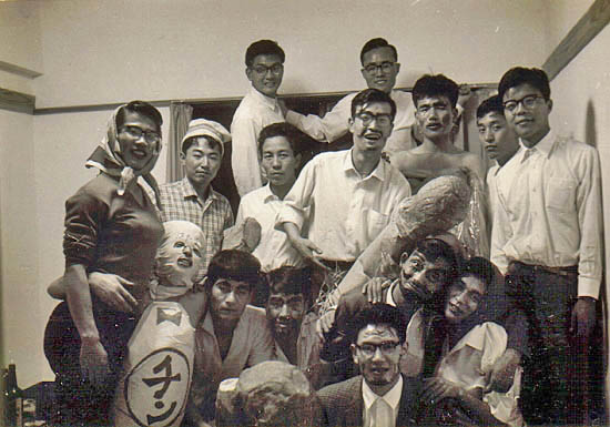 二列目左から三人目が原さん、その左端は原さんと同室だった新谷さん、この列の右端に同じく女装した早川さん、その他故人となった石井さんなどの顔ぶれが並ぶ