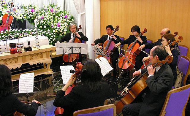 お通夜でチェロを弾く仲間達。 曲目はゴルターマン「二つの小品」よりレリジオーソ。