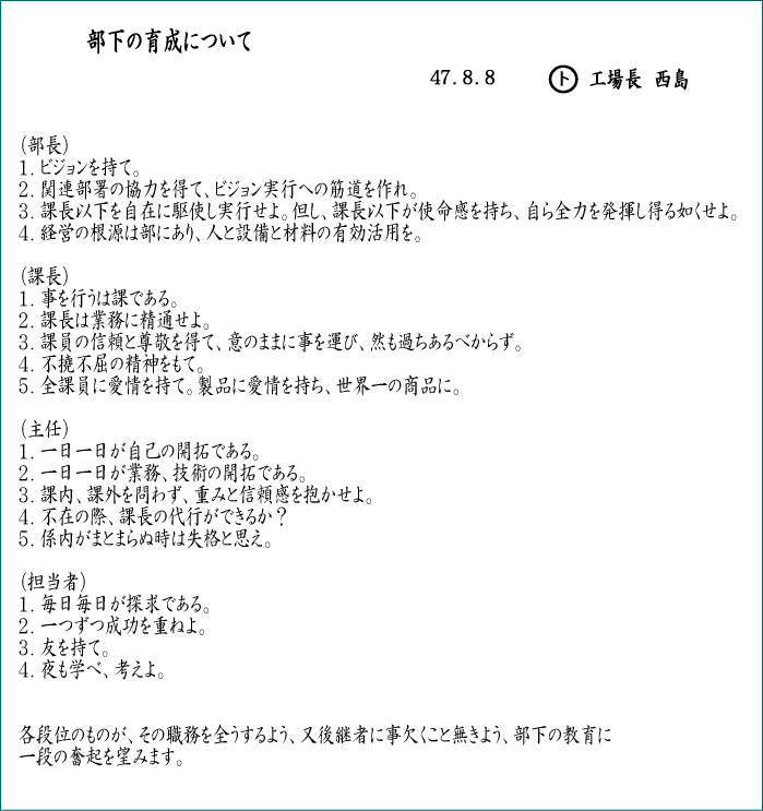 俗に言う西島語録は数多く伝えられているが、とくにトランジスタ工場長のときに配布された「部下の育成について」は、定年退社するまで常に机の上に置いて参考にさせていただいた。